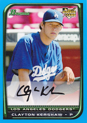 A shiny blue bordered Kershaw from 2008 Bowman. It is numbered 346/399. I don't know how Bowman knew that Kershaw was going to strike out 346 batters in 2011, but I am impressed.