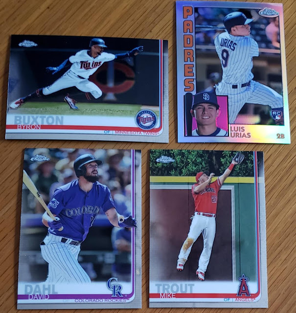More Chrome cards of small-market teams, alleviated by a Trout card, which is always nice to get in chrome form. Luis Urias is the guy the Padres traded to the Brewers in November, which automatically means Urias will perform better because he's not wearing a Padres uniform. But hopefully not too much better because he's wearing a Brewers uniform!