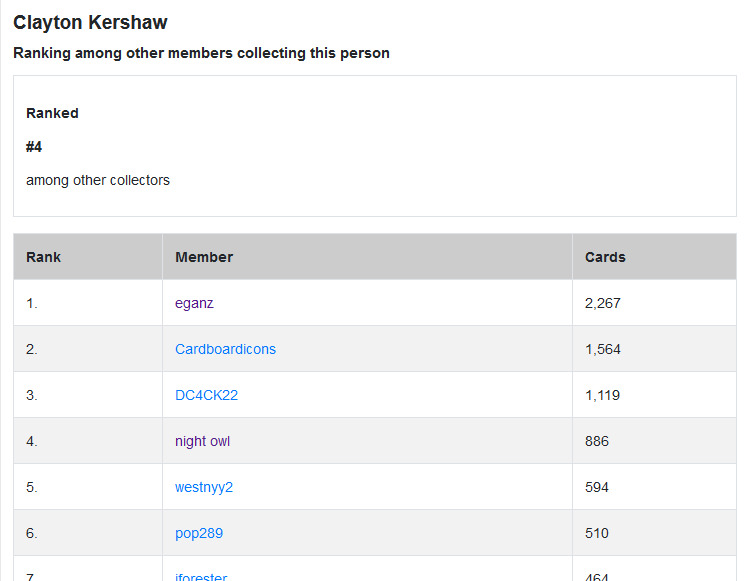 I don't expect I'll ever surpass the top two Kershaw dudes. Cardboardicons, a fellow blogger, is actually a Red Sox fan so he should be giving all of his Kershaw cards to me any minute now as the logical thing to do.