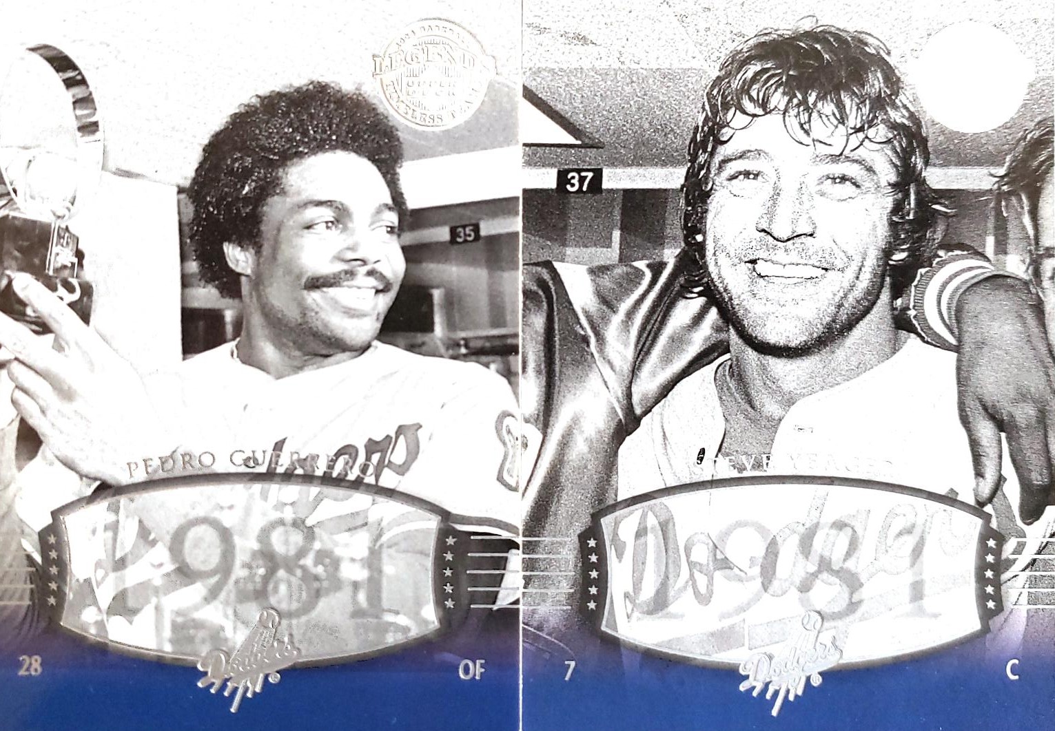 These are two more accurate pairings from 1981. Both Pedro Guerrero and Steve Yeager are celebrating in the Yankees locker room after winning the 1981 World Series. Guerrero is holding the MVP trophy that he shared with Ron Cey and Steve Yeager. On the Yeager card, his arm can be seen wrapped around Yeager.
